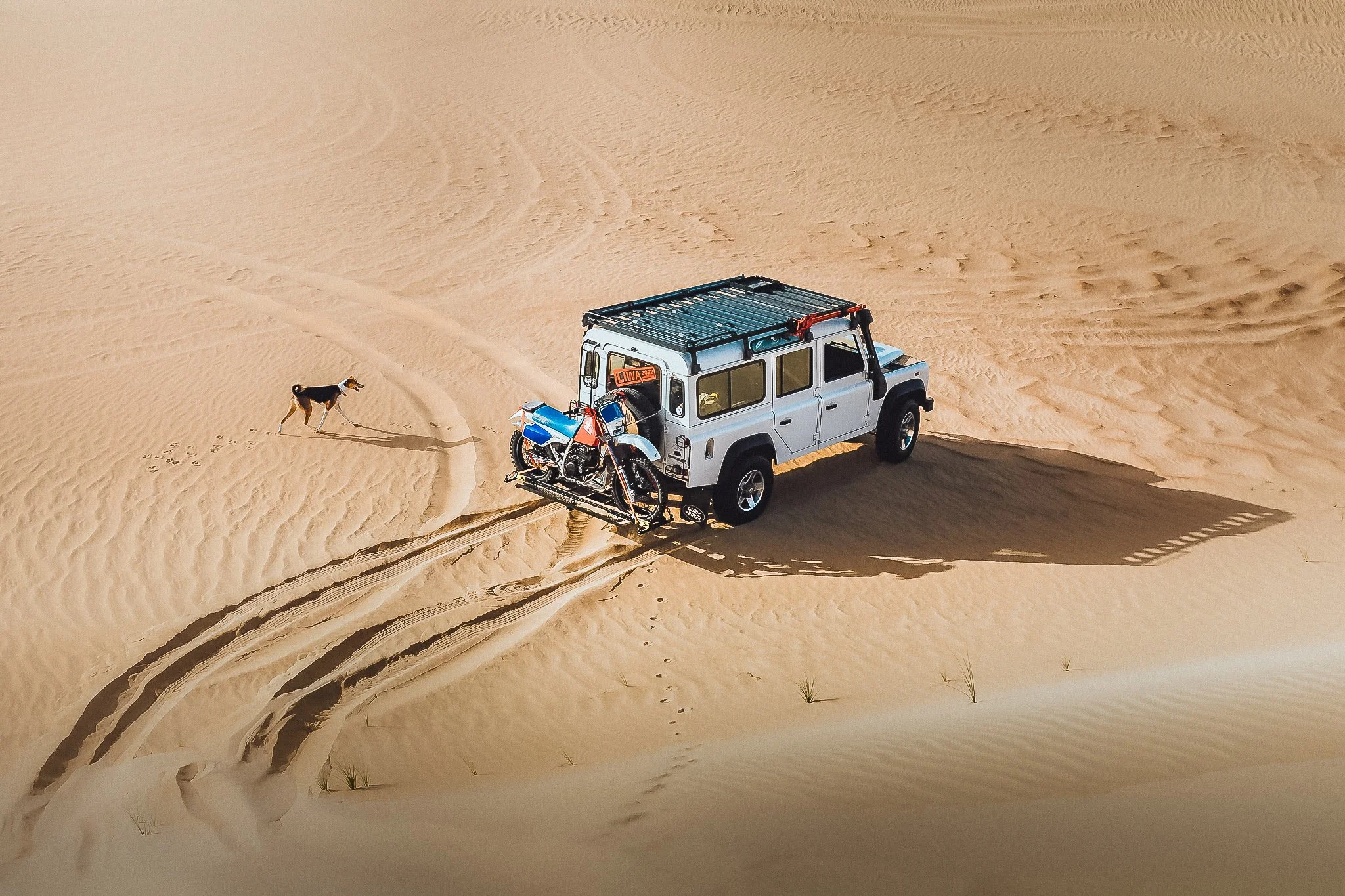 I landed in Dubai with little or no expectations. I realised how much Instagram has connected me with such amazing people all over the world. I took this opportunity to catch a 5am LHD 2013 Landrover Defender 110, Honda XR250r and a Goose the dog with my friends @sandythelandy and Chirenj Chandran.